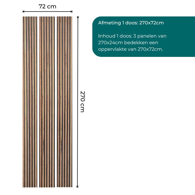 afmeting: 270x72cm (inhoud 3 panelen van 270x24cm) bedekt een oppervlakte 270cm x 72cm (dikte 2,5 centimeter).