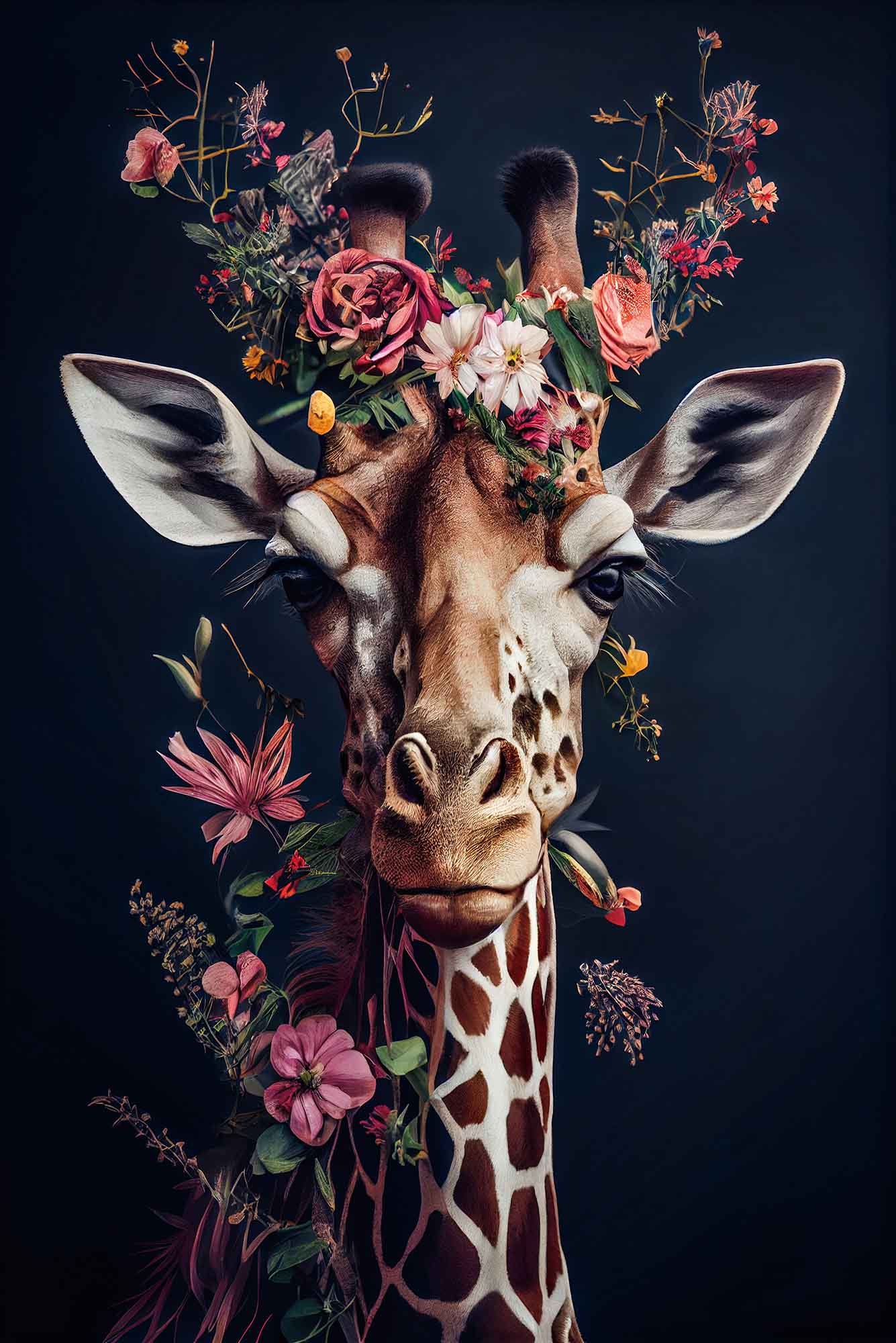 Deze afbeelding toont een schattige en kunstzinnige voorstelling van een giraffe met bloemen en planten om haar nek. De giraffe kijkt direct naar de camera, en de bloemen voegen een kleurrijk en fantasierijk element toe aan de foto, terwijl de donkere achtergrond de focus volledig op de giraffe en de bloemen houdt. Het resultaat is een surrealistisch en artistiek portret dat natuur en verfijning combineert.