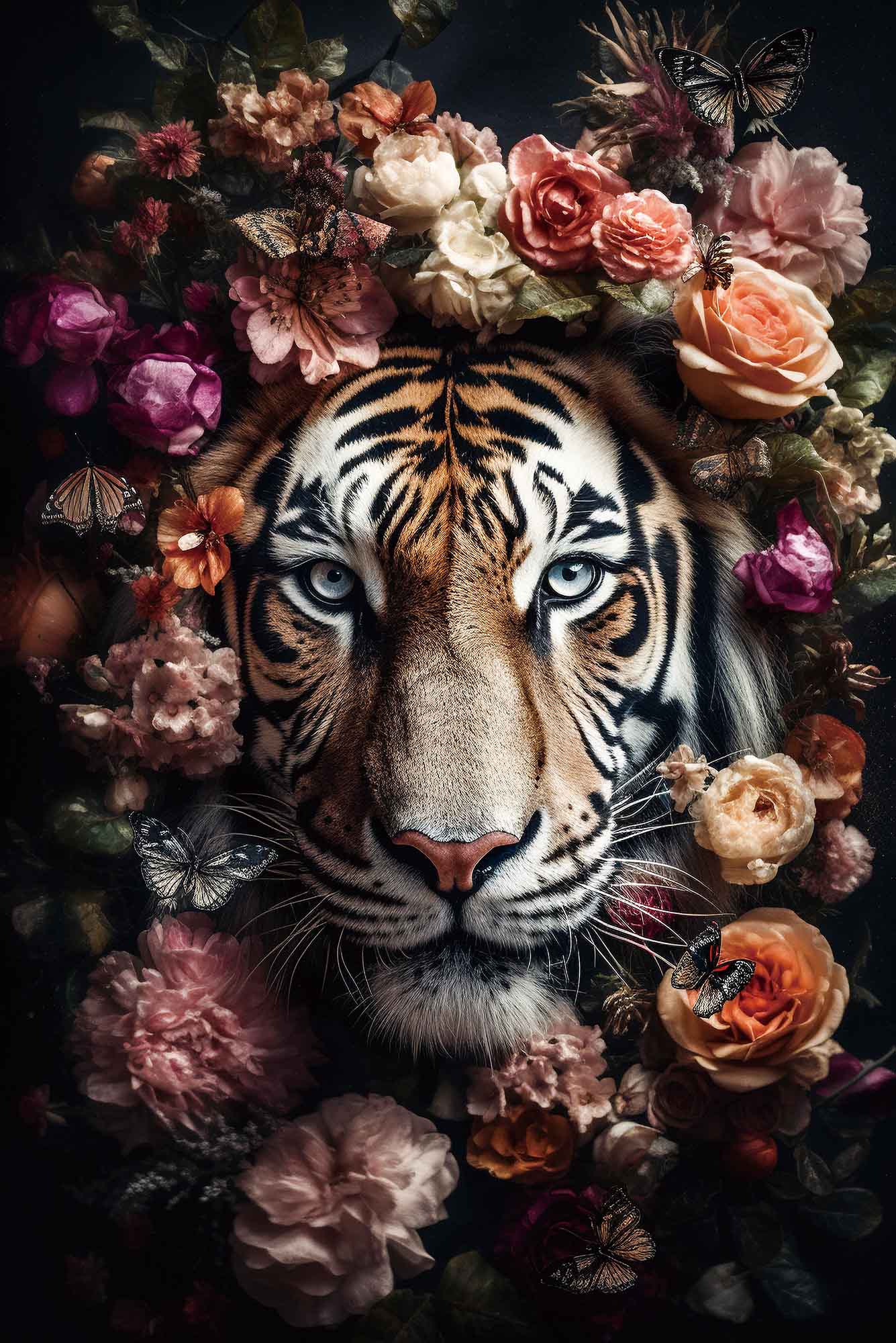 Deze afbeelding toont een indrukwekkend portret van een tijger met opvallend heldere, blauwe ogen. De tijger wordt omringd door een bloemenkrans met een verscheidenheid aan kleurrijke bloemen en enkele sierlijke vlinders, wat een contrast vormt tussen de kracht en de delicate schoonheid van de natuur. Het geheel heeft een artistieke en betoverende uitstraling, waarbij de tijger centraal staat als een sierlijk en krachtig symbool.