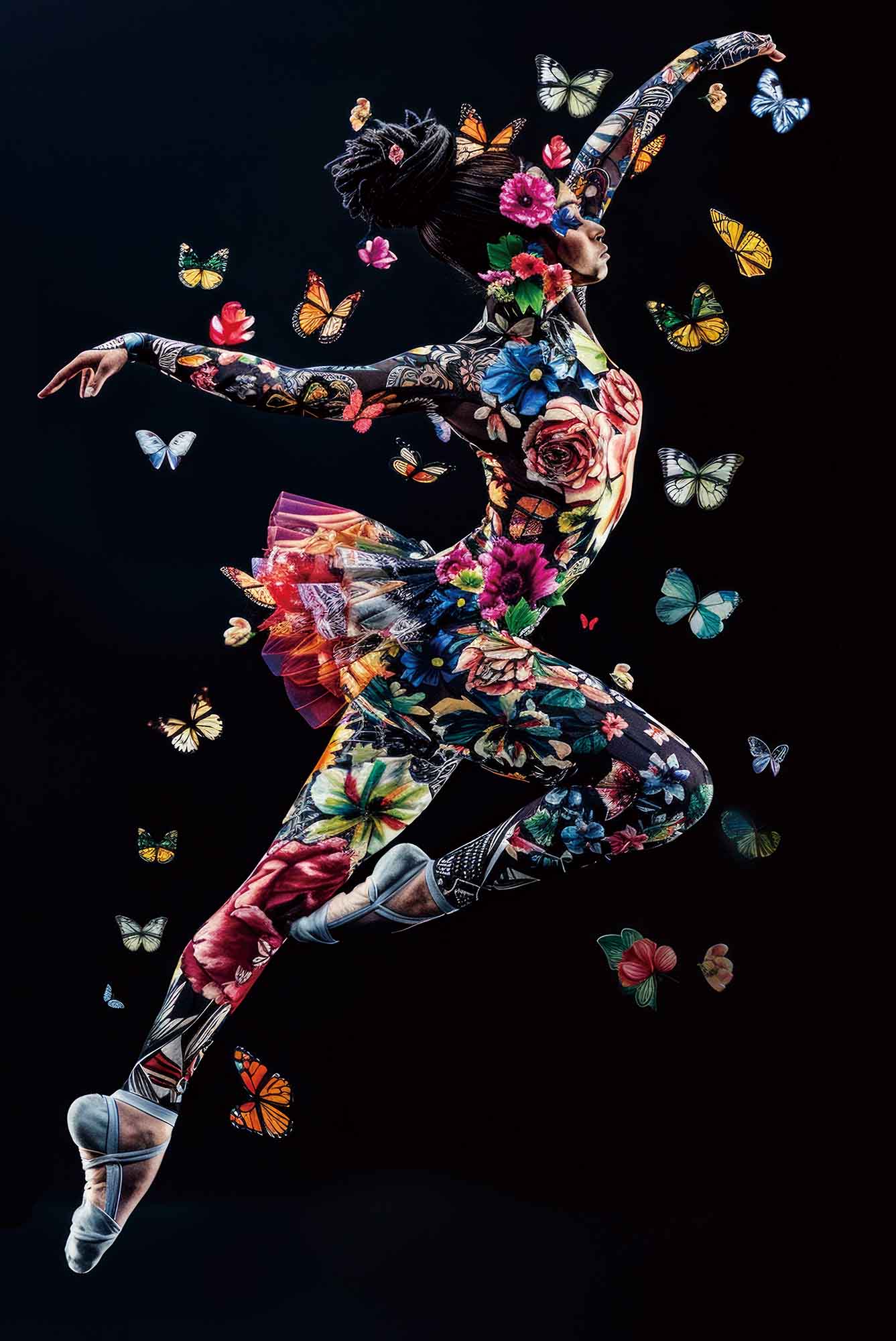 Deze afbeelding toont een danseres in een dynamische sprong, gekleed in een zeer kleurrijk en gedetailleerd pak dat volledig bedekt is met bloemen en vlinders. Haar haar is opgestoken in een grote, creatieve knot, en ze is omringd door nog meer vlinders die lijken te vliegen rondom haar. De achtergrond is zwart, wat de levendige kleuren van haar outfit, bloemen en vlinders benadrukt, en een gevoel van beweging en magie creëert. Het geheel straalt vreugde, vrijheid en artistieke expressie uit.