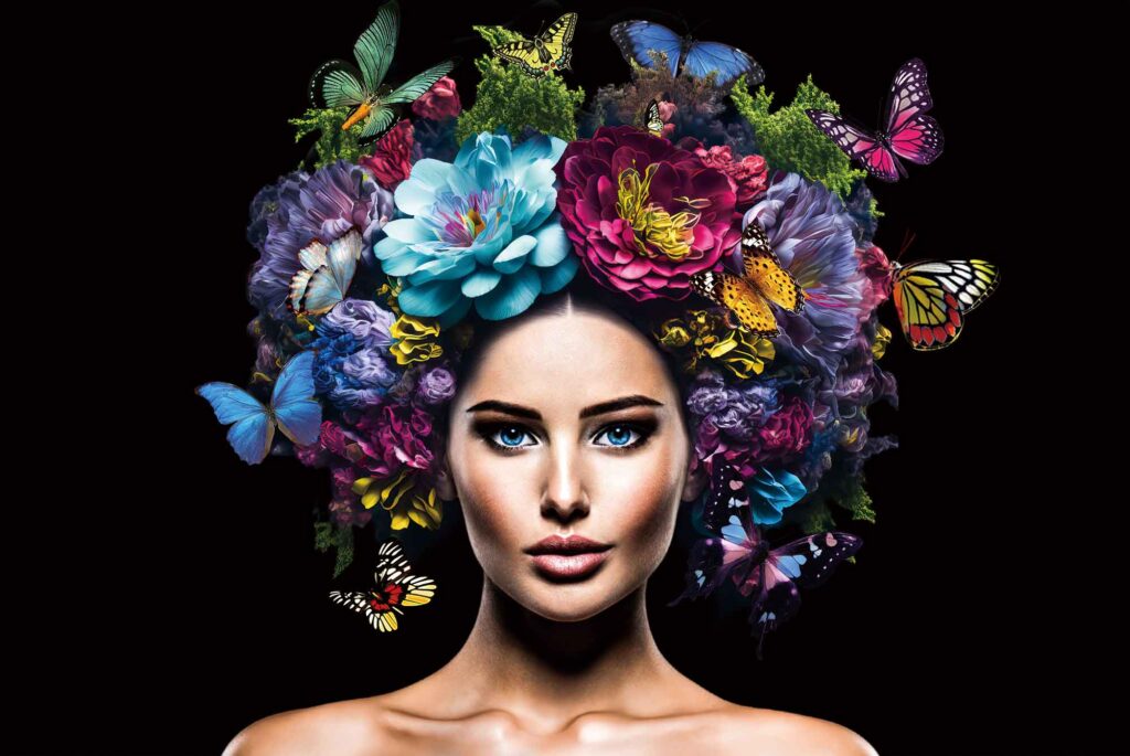 Glasschilderij Head Full Of Flowers 80x120cm