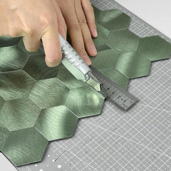 - Verwijder niet gelijk de hele vel van de stickerlaag, maar eerst de helft en kijk of het goed past. Hierdoor kan je de tegel nog los krijgen, mocht het niet passen of niet goed zitten.